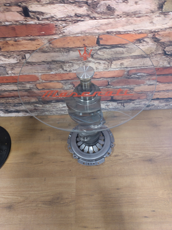 Authentische Maserati V6 Biturbo Kurbelwelle und Kupplung: Integriert als Tischfuß, direkt aus dem legendären Maserati V6 Biturbo.